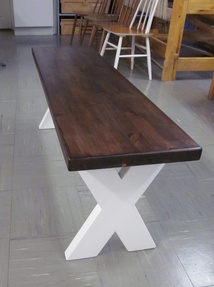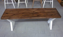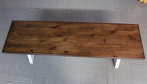 Pöytä (mitat: P 200 ja leveys 90 cm) ja kaksi selkänojallista penkkiä.