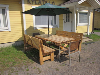 Mitat: L 140 x P 150 cm + terassi 140 x 70 cm. Kok.pituus 220 cm. Sisäkorkeus 180 cm.