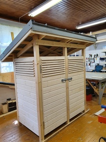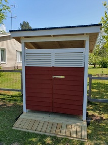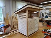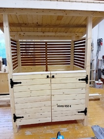 Kahdelle 240 tai yhdelle 660 litran jäteastialle, pulpettikattoinen, hinta 600 €.