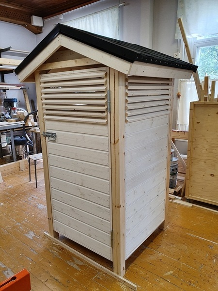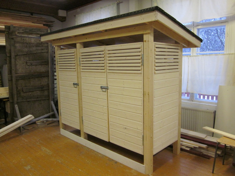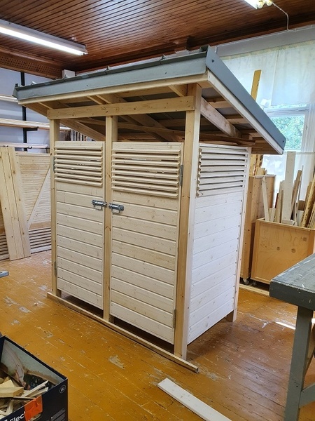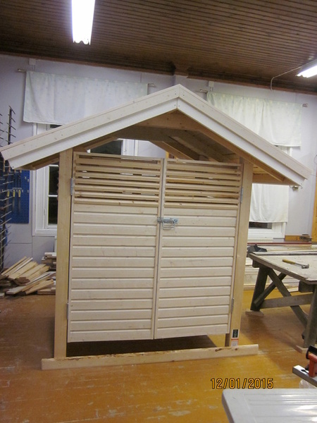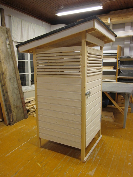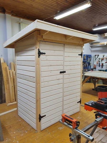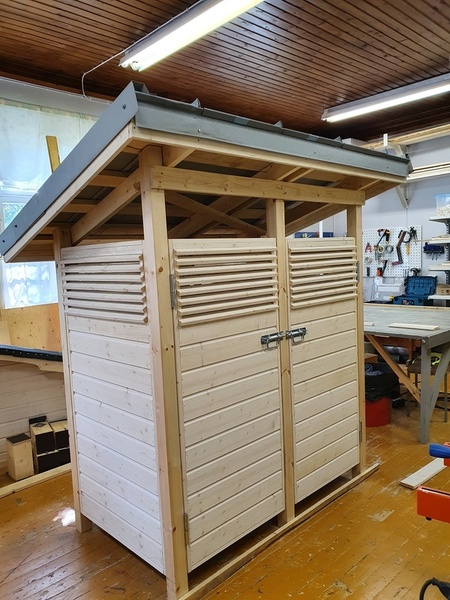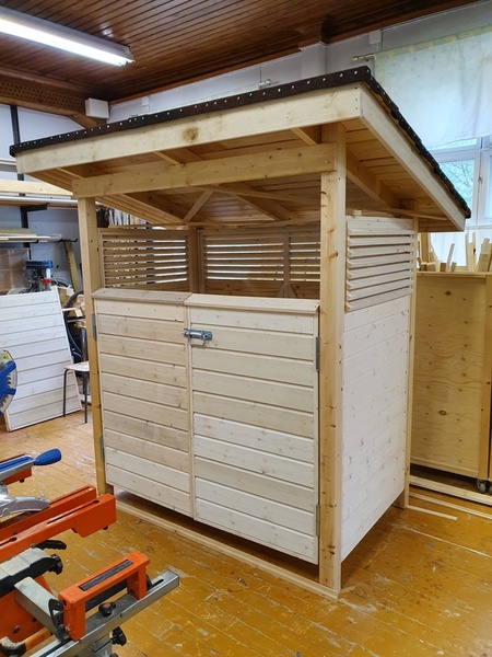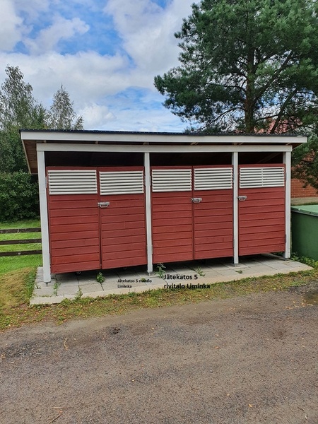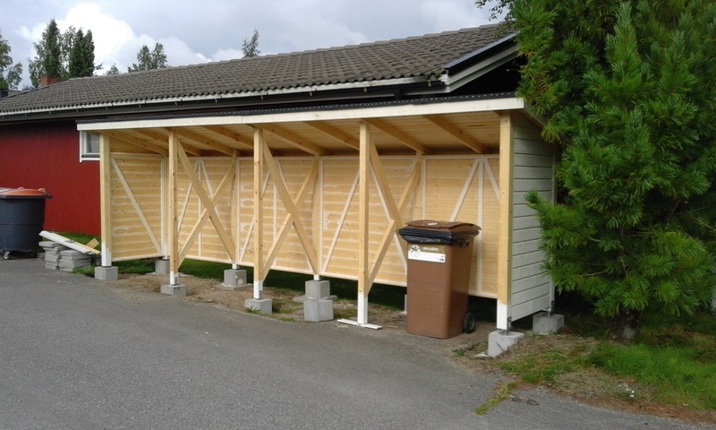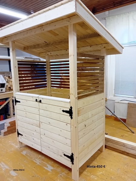 Kahdelle 240 tai yhdelle 660 litran jäteastialle, pulpettikattoinen, hinta 600 €.