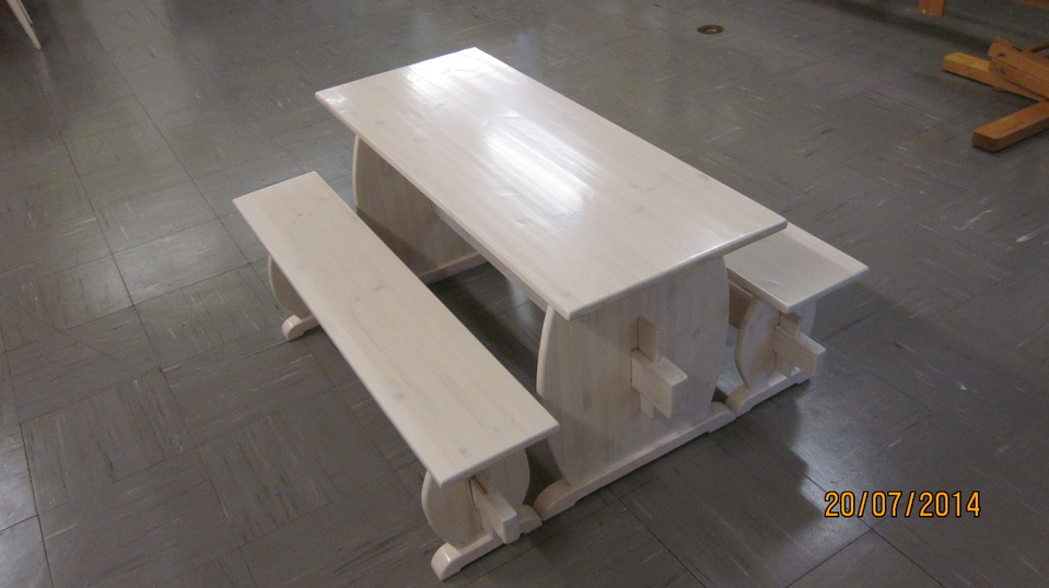 Pöytä (mitat: P 200 ja leveys 90 cm) ja kaksi selkänojallista penkkiä.