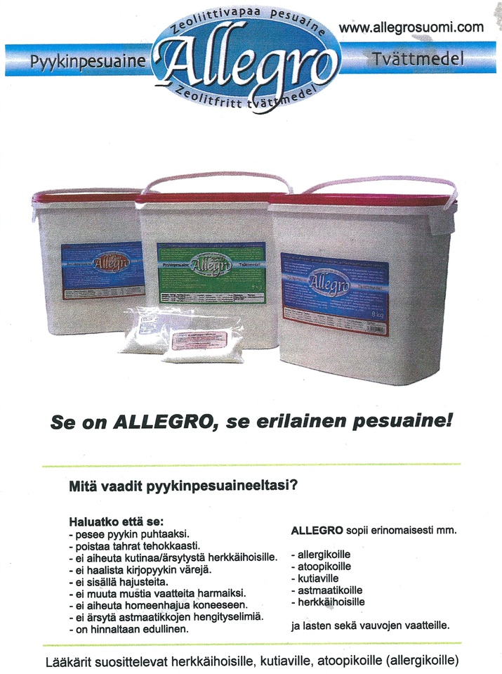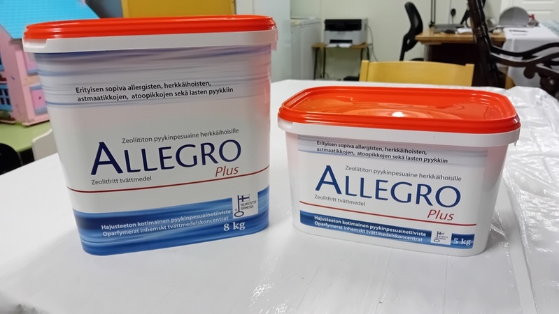 Myynnissämme ALLEGRO PLUS ja EKO pyykinpesuaine 8 kg (sis. myös koneenpuhdistusaineen ja 0,25 kg pesuntehostajaa valko- ja hyvin likaiseen kirjopyykkiin) sekä Allegro huuhteluaine 3 litraa.