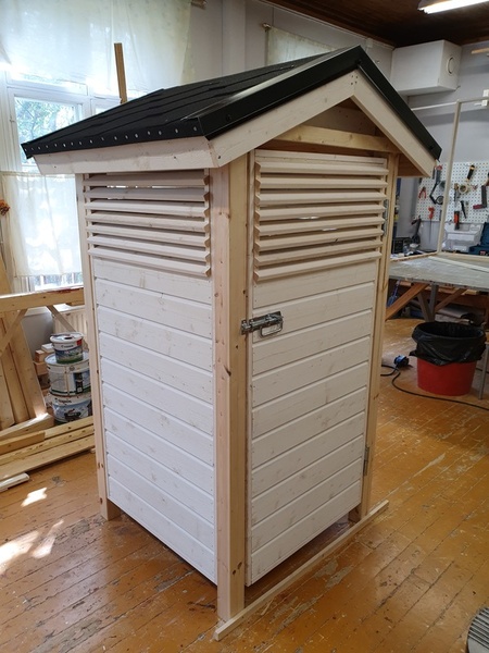 Kahdelle 240 tai yhdelle 660 litran jäteastialle, harjakattoinen, hinta 650 €.