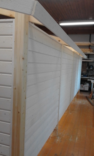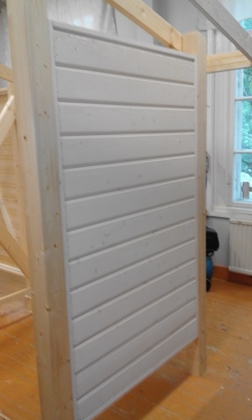 Seinäelementtien pinta pohjamaalattua ulkovuorilautaa.