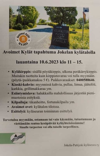 | Avoimet Kylät esite.pdf (677 kB) Avoimet Kylät-tapahtuma Jokelan kylatolla la 08.06.2024 klo 11-15. |