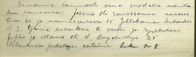 Toiminta oli alussa todella vilkasta, sillä yleisiin kokouksiinkin saattoi osallistua jopa 35-40 seuran jäsentä ja johtokunnan kokouksiinkin osallistuivat yleensä kaikki valitut jäsenet. Vasemmalla toimintakertomuksesta kopio vuodelta 1938 (klikkaa tekstiä avataksesi ne suuremmaksi).